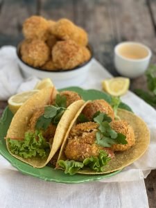 Calentar el horno a 180C. Hornear por 20 minutos o hasta que esté doradas y crujientes. Pueden servirlas como taco, con ensalada de repollo y zanahoria, palta y salsa picante.