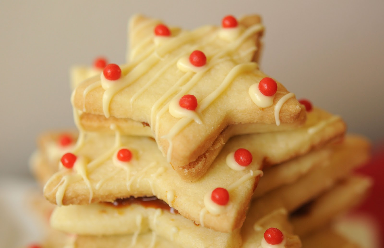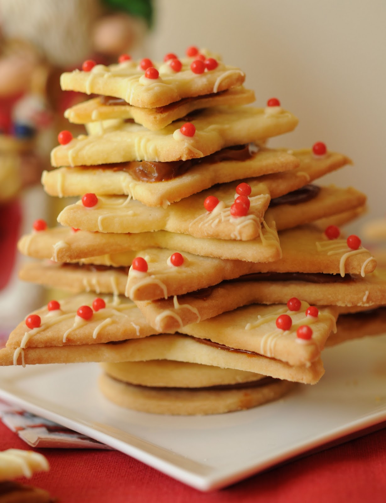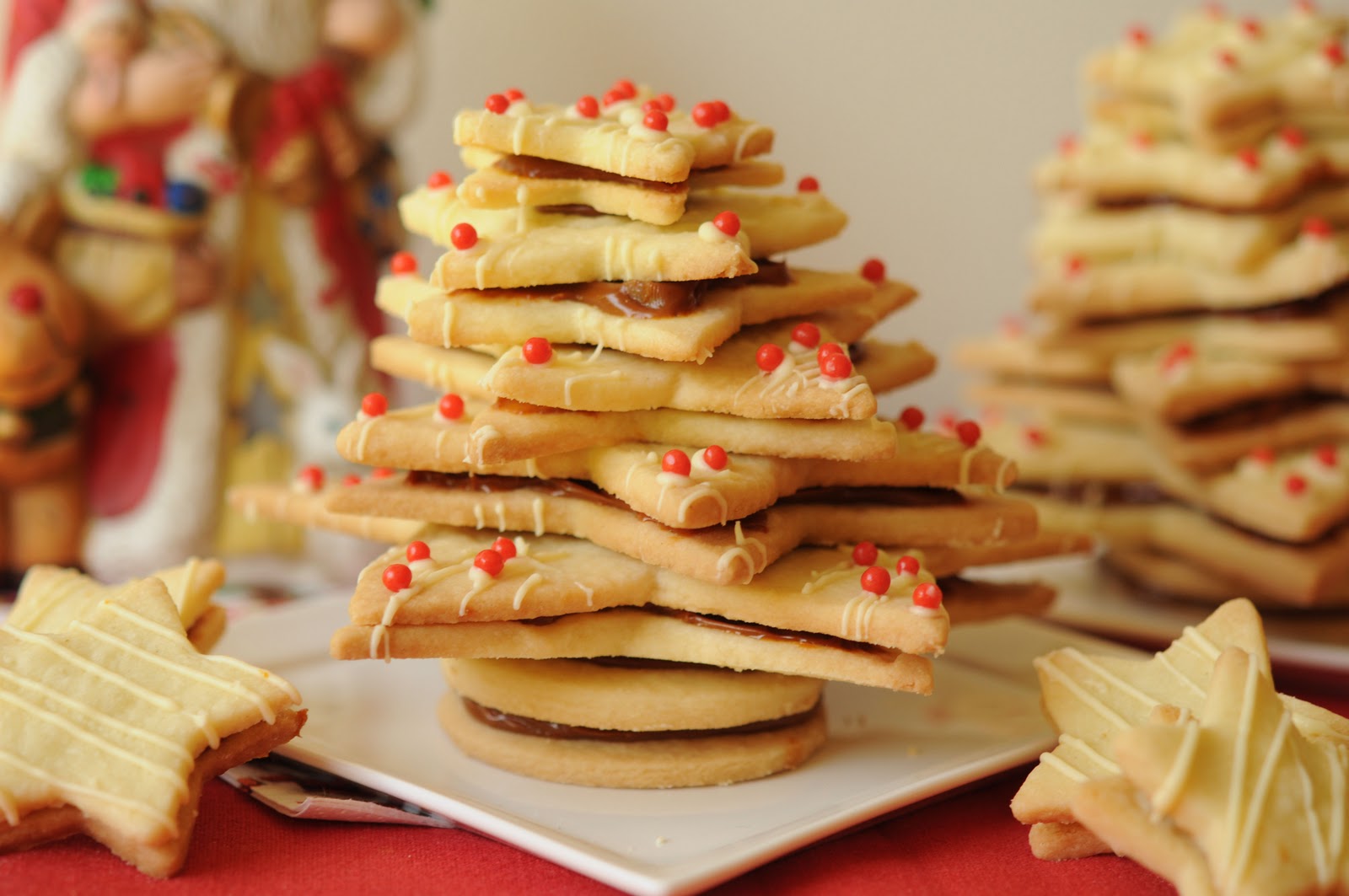 He visto varios árboles de galletas esta temporada y encuentro que se ven tan bonitos. Quise hacer mi versión y decidí hacer un árbol con alfajores de maicena. Estaba asustada con mi elección ya que estos alfajores son más delicados. Lo primero es que no tenía que ser muy alta, por lo que usé 5 moldes de estrella de distintos tamaños. Además les hice una base de alfajor redondo. Todas las galletas las uní con manjar y les recomiendo que el manjar esté a temperatura ambiente para esparcirlo más fácilmente.
