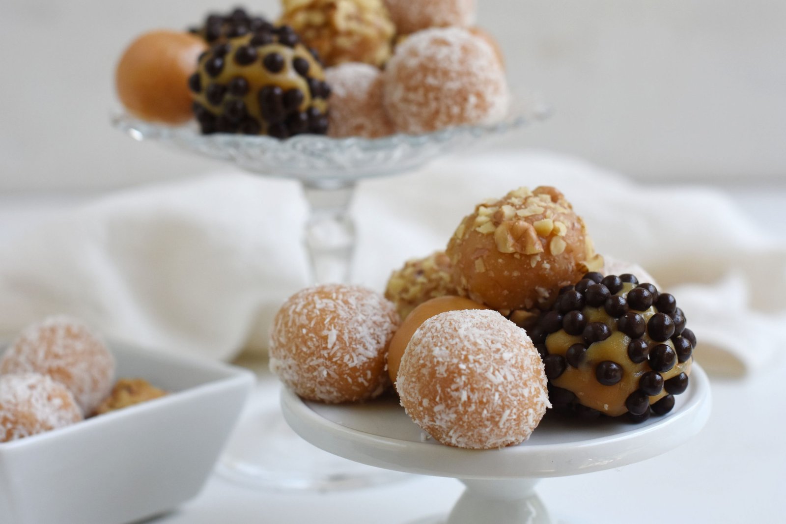 Derretir la mantequilla en una sartén grande. Agregar la leche condensada y el manjar. Cocinar a fuego medio alto, revolviendo hasta que la mezcla espese y se pueda ver bien el fondo de la sartén (como que se despega), 10 minutos. Poner en una fuente plana y dejar enfriar por completo (pueden refrigerar para apurar el proceso). Sacar de a cucharaditas de la mezcla de caluga y dar forma redonda con las palmas (no se deberían pegar, pero si se les pegan, engrasarse las manos). Pasar los bombones por el fruto seco que quiera o chocolate o las dejan así no más.