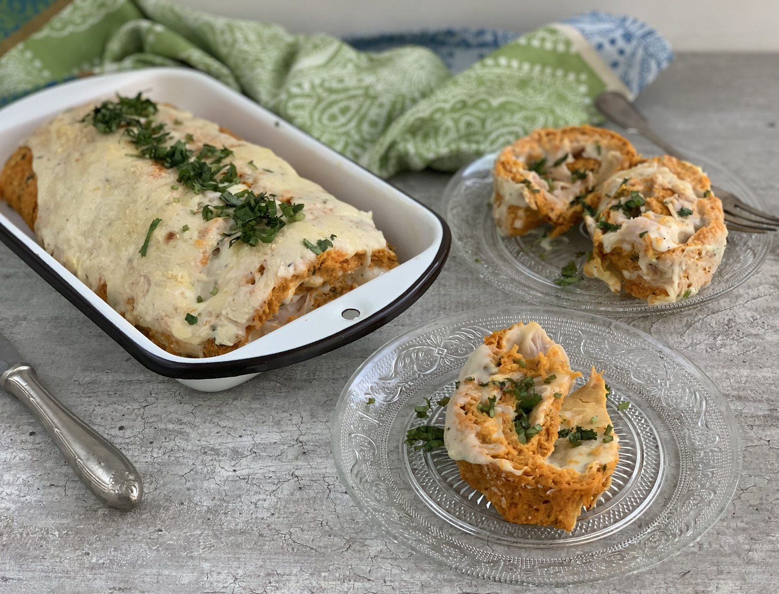 - Rellenar con una capa de salsa blanca, luego queso y jamón. Enrollar como brazo de reina, yo lo hice por el lado corto para que quedara más alto. Traspasar con cuidado a una bandeja, o a algo que pueda ir del horno a la mesa (porque a mí, me tuvieron que ayudar para traspasar a un plato). Le puse más salsa blanca arriba con un poco de queso. Llevar al horno a gratinar. Servir espolvoreado con cilantro.