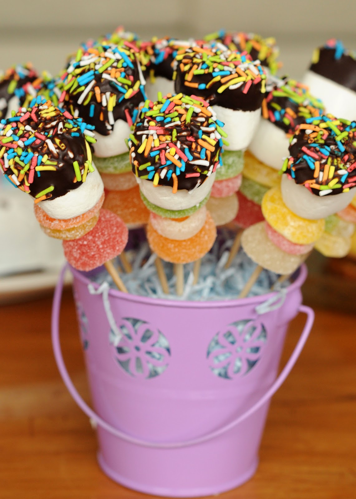 arreglo que hice con brochetas de dulces para decorar la mesa. Son muy fáciles