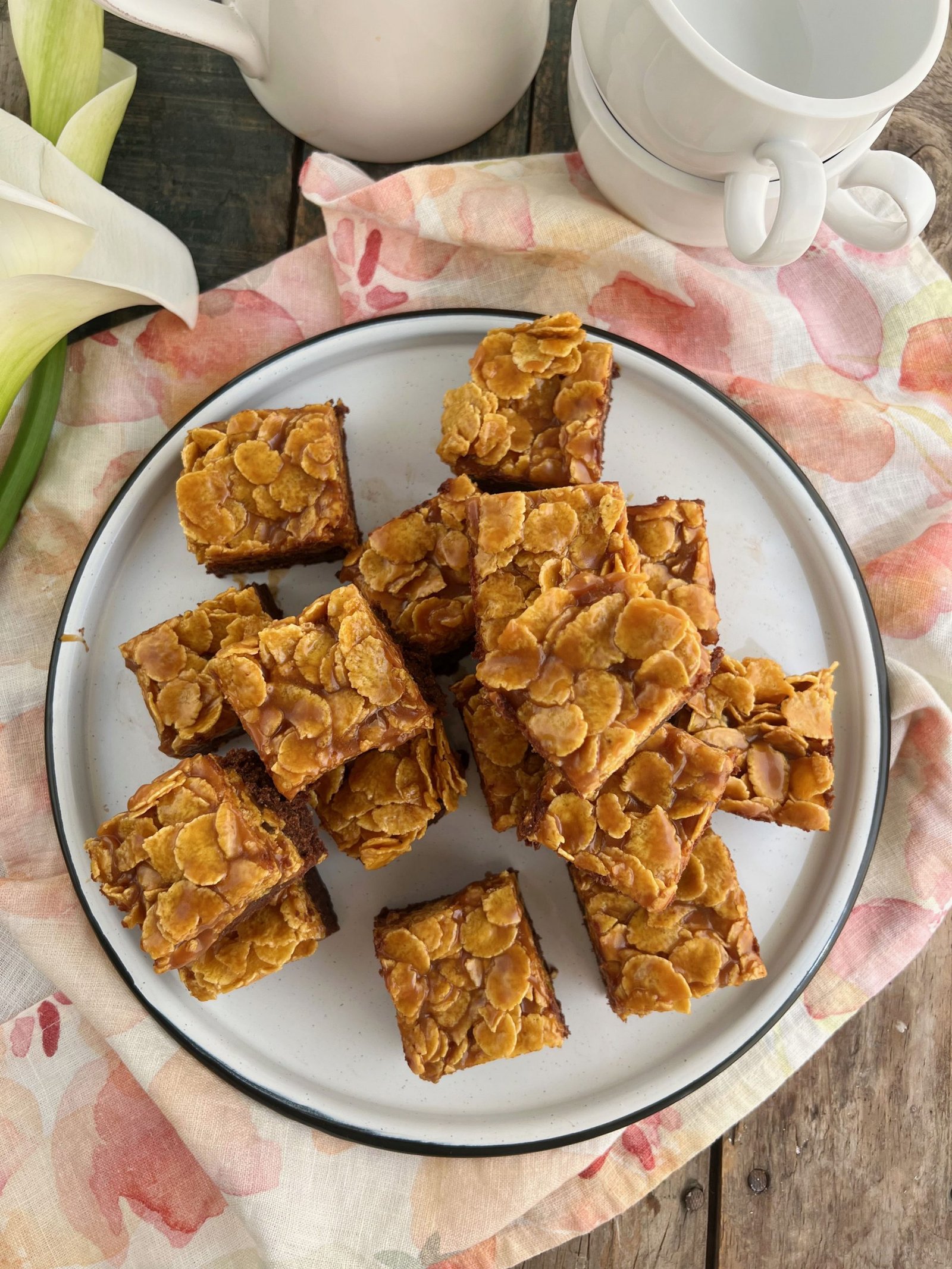 Para el caramelo, poner el azúcar en una olla. Calentar a fuego medio bajo hasta tener una caramelo. Sacar la olla del fuego y agregar la mantequilla junto a la crema. Volver al fuego y cocinar, revolviendo, hasta tener una mezcla homogénea. Agregar el cereal de maíz, revolver bien y poner arriba del brownie.