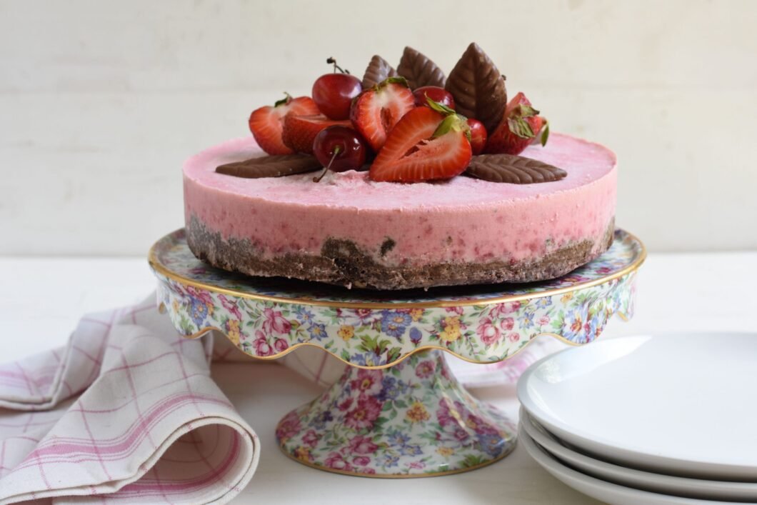 • Mientras tanto, procesar el queso crema, yogurt natural y azúcar, hasta tener una mezcla cremosa. Incorporar las frutillas y el jugo de limón. Procesar hasta homogenizar. Sacar las hojas del agua, y estrujar con las manos. Poner en un pote, y poner a baño maría a disolver (o lo ponen 8 segundos al microondas). Con el procesador andado, añadir la gelatina disuelta. Poner la mezcla en el molde preparado y llevar al congelador por al menos 4 horas. Sacar el postre 15 minutos antes de servir. Decorar con fruta fresca.