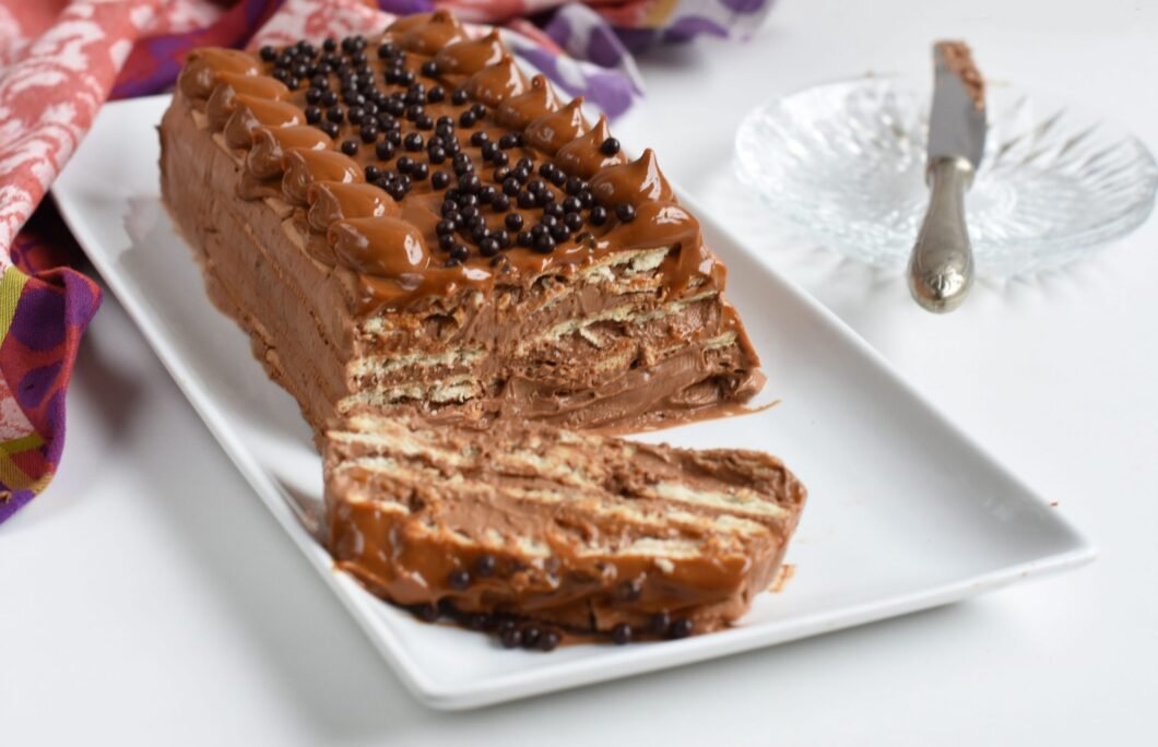 Hace tiempo que quería hacer la chocotorta, receta típica de Argentina, pero nunca he logrado que me duren las galletas de chocolate. He visto en varias cuentas de allá, hacer la chocotorta invertida y como tenía galletas de vino, decidí hacer esta delicioso postre. Es una torta contundente, así que coma de a pedazos chico, aunque no es tan dulce como se ve. Para dar un toque distinto, remojé las galletas en una leche infusionada en té negro de Supremo (no tenía, pero me tinca que debe quedar rico con un chai también).