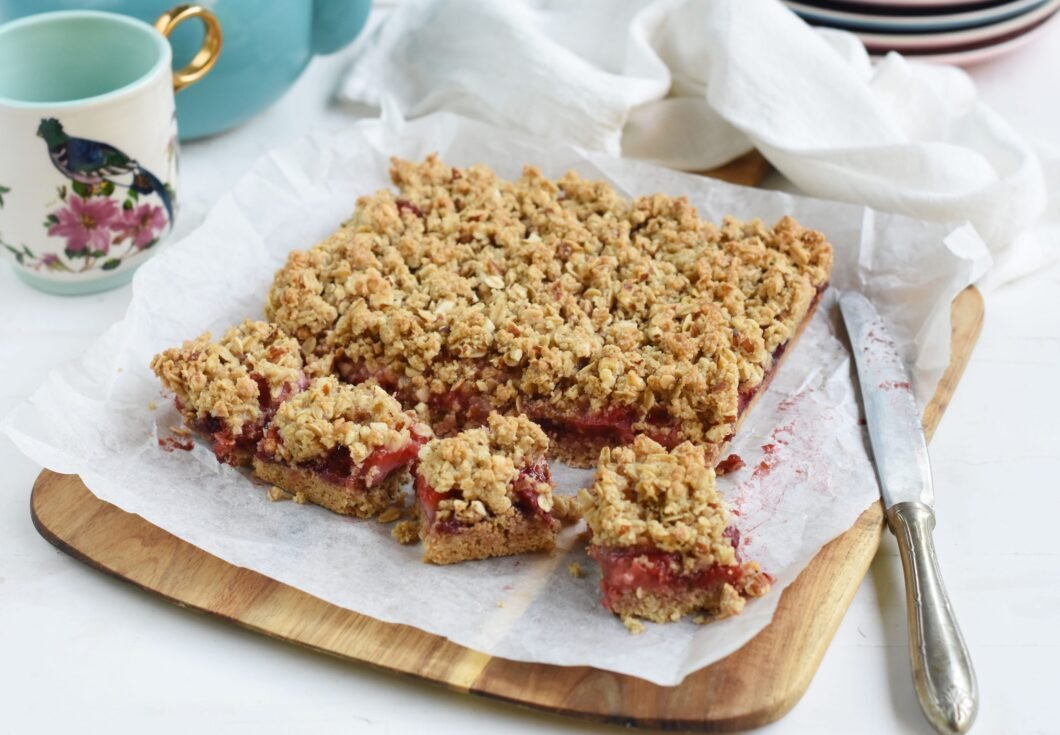 • Sacar la masa del horno, esparcir la mermelada de frambuesas (la preparada), poner las frutillas laminadas y tapar con las migas de la cubierta. Hornear por 20 a 25 minutos o hasta que la cubierta esté dorada. Dejar enfriar, desmoldar y cortar en cuadrados.