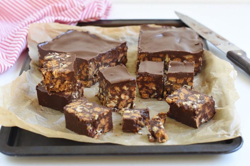 Amo las preparaciones con chocolate y más aún si tienen algo crocante. Estos cuadraditos son deliciosos y muy fáciles de preparar. Pueden usar las galletas que les gusten, ideal que sean crujientes y con el sabor que se complemente con el chocolate. Cuando los hagan se van a acordar de mí, porque son deliciosos, ideales para poner en una tabla de postre o para darse un gustito (bueno ya, de vez en cuando).