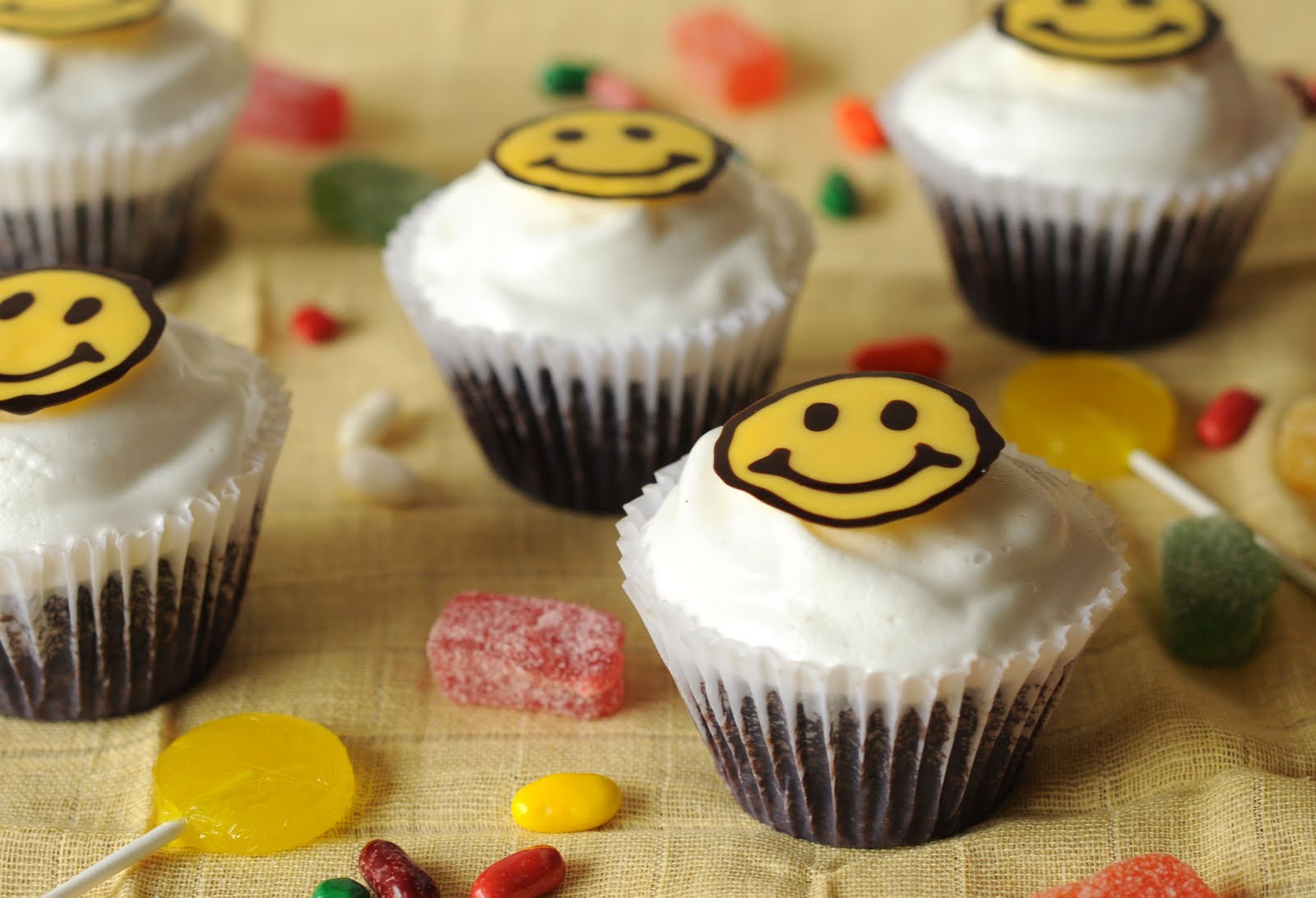 Las caritas felices las hice con chocolate blanco teñido de amarillo y chocolate negro, usando un dibujo que saqué de internet y que usé como molde.