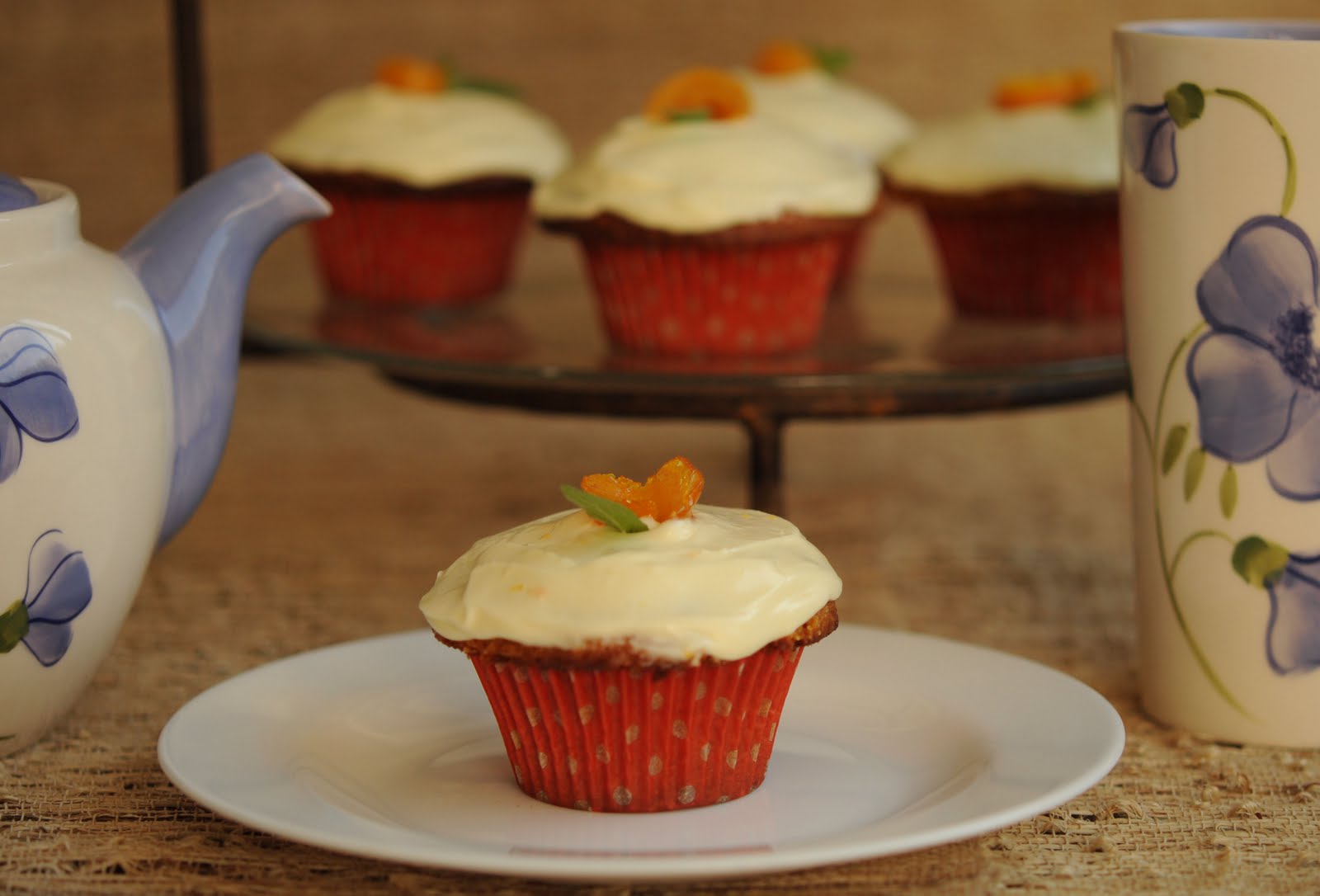 La receta de los muffins son de mi amiga Sol (del Blog Cocina de Mercado y Quinoa, su rico restaurant), salieron en la “revista Ya” cuando ella hizo una sección de muy buenas recetas. Yo les agregué harina de almendras y les puse una cobertura de queso crema y naranja, pero si los quieren más livianitos y sanos, no se la pongan (aunque quedan muy ricos y bonitos). Los decoré con cascara de naranja que confité unos minutos en almíbar y una hojita de menta.