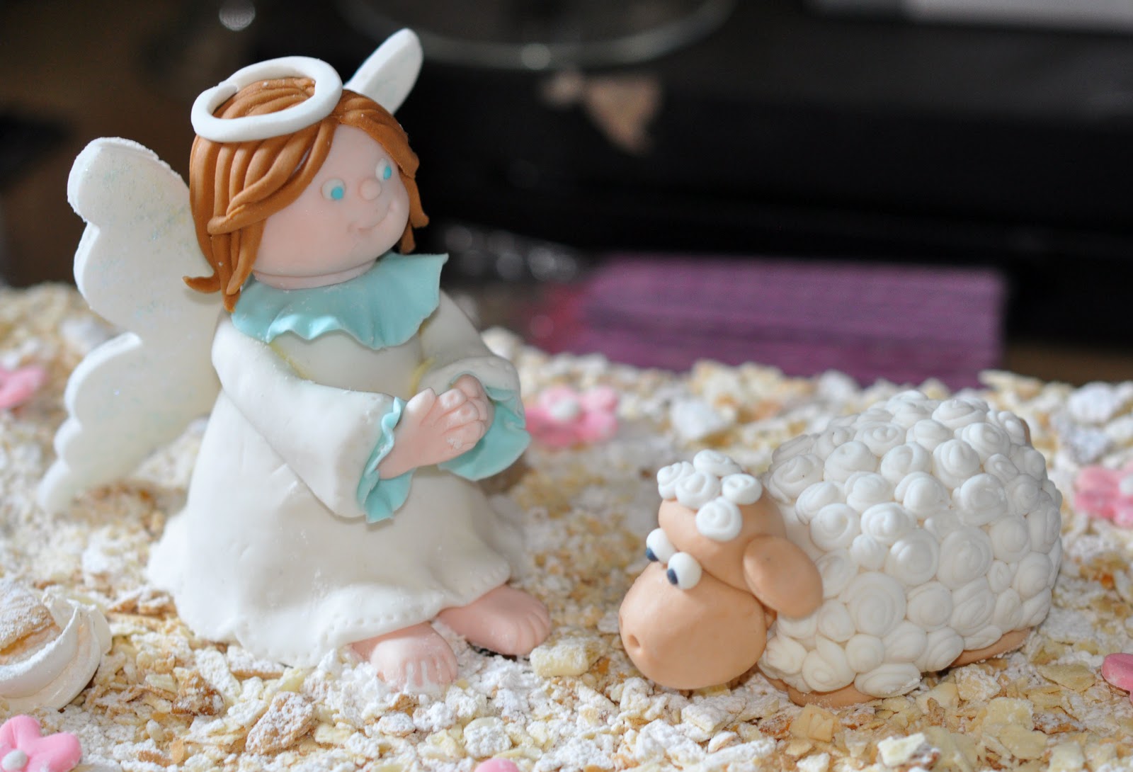 Acá estoy todavía un poco enferma con un virus al estómago que me contagié de mi chiquitita. Como no he tenido ganas de cocinar, les dejo unas fotos del angelito y oveja que hice para decorar la torta para la primera comunión de mi hija.