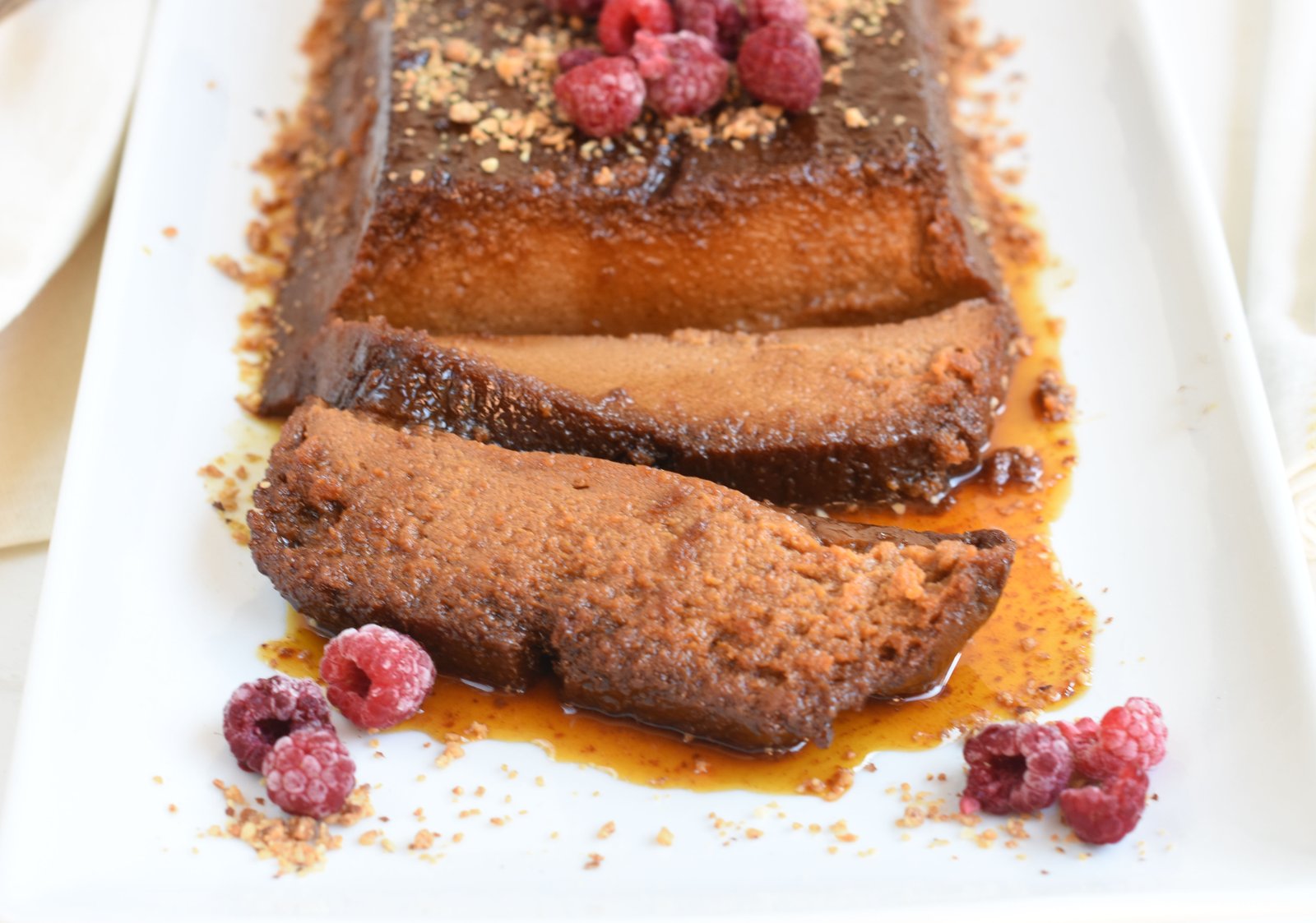 - Para servir, calentar el poto del molde, soltar los lados del flan y dar vuelta sobre un plato de servir. Yo lo decoré con praliné y frambuesas congeladas.