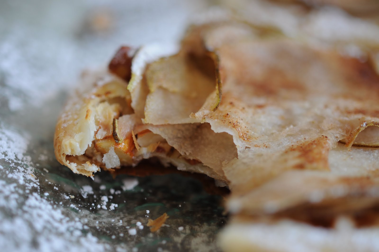 Les tengo que reconocer que esta tarta delgada y crujiente fue un invento impulsivo para usar una masa de hoja que habíamos preparado en el curso de pan que estoy tomando. Vi qué tenía en la casa y listo. La llevé para el cumpleaños de mi hermano y a todos les gustó; el sabor a la pera no se nota tanto pero la combinación de todos los ingredientes fue rica, ya que quedó crocante y liviana.