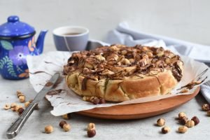 - Poner la masa en el mesón, levemente harinado. Formar un rectángulo de 40 x 30 cm aprox (con las manos y uslero). Esparcir la nutella, poner las peras y las avellanas por toda la superficie. Cortar 4 tiras iguales a lo largo. Ir enrollando una tira para formar un rollo. Luego seguir enrollando el rollo con las siguientes tiras para formar un maxi rollo. Con la ayuda de una espátula grande, poner el rollo en un molde de torta de 24 cm con papel de hornear en su interior. Con cuidado, usando las manos, separar las capas.