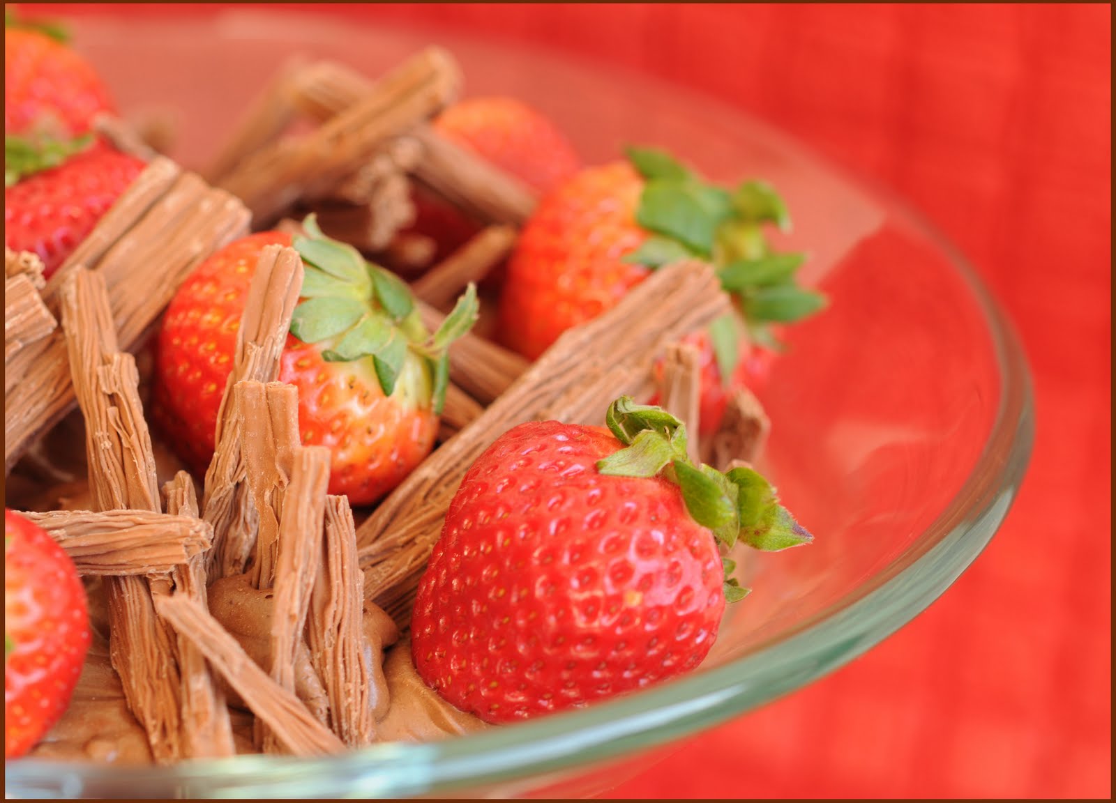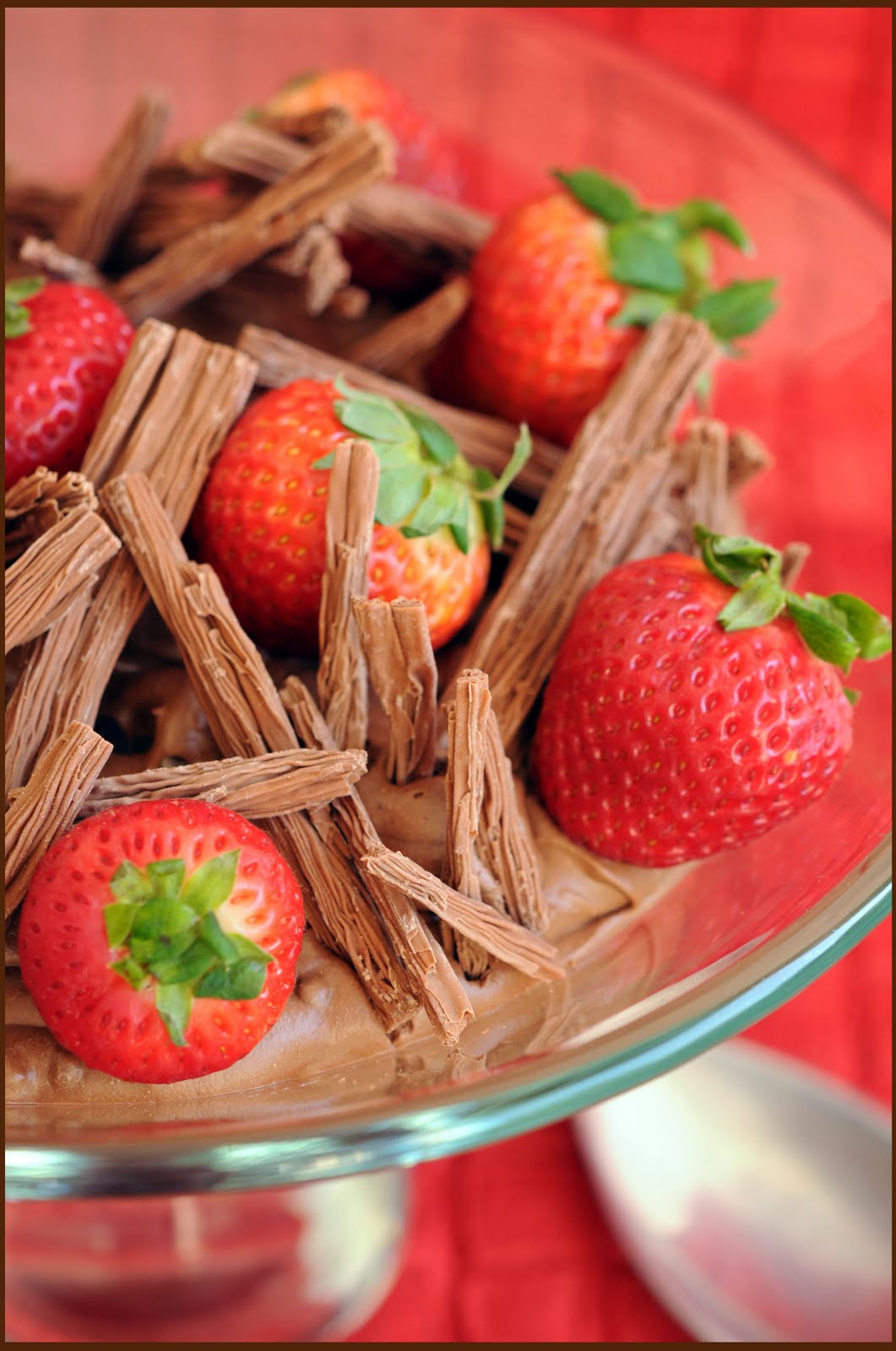 Poner el mousse en un copón, decorar con chocolate en ramas o rulos y frutillas.