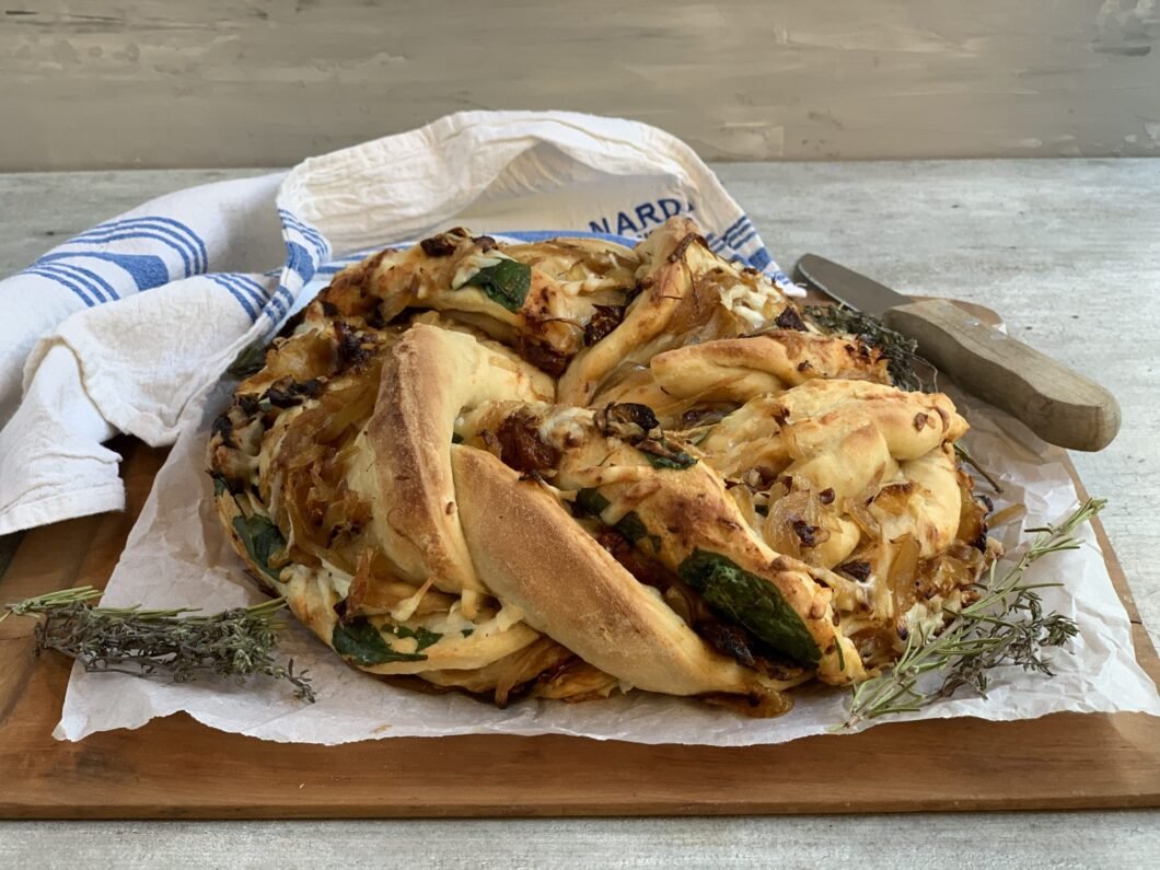PAN RELLENO CON CEBOLLA CARAMELIZADA, TOMATES SECOS Y ESPINACAS
