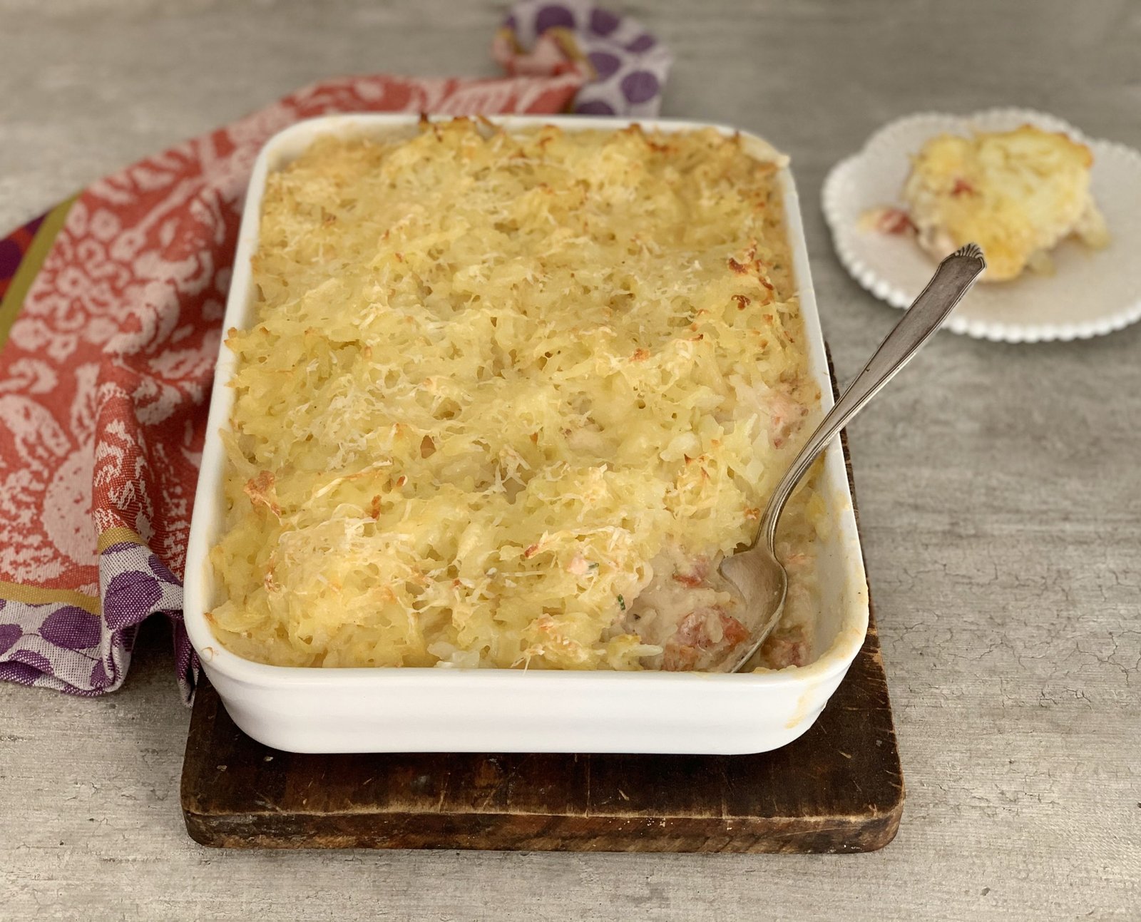 un rico pastel de salmón con una cubierta de papa rallada para chuparse los dedos