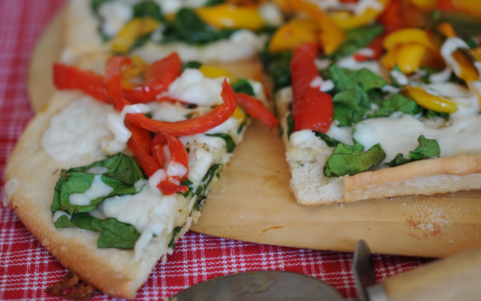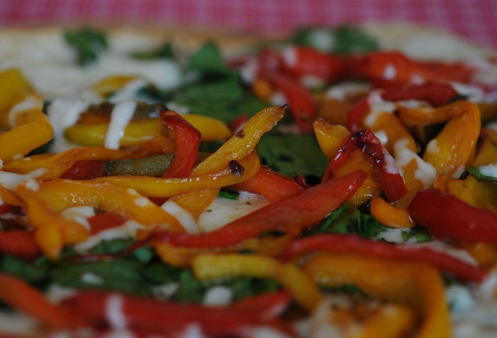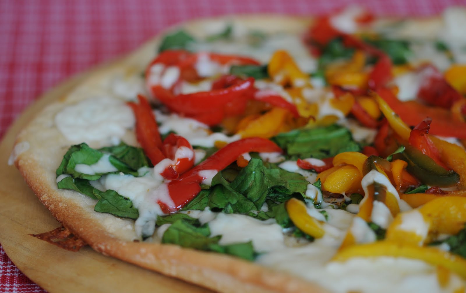 Poner la mitad de queso, luego los pimentones, la espinacas y finalmente el resto del queso. Volver al horno y hornear hasta que el queso se haya derretido. Servir inmediatamente.