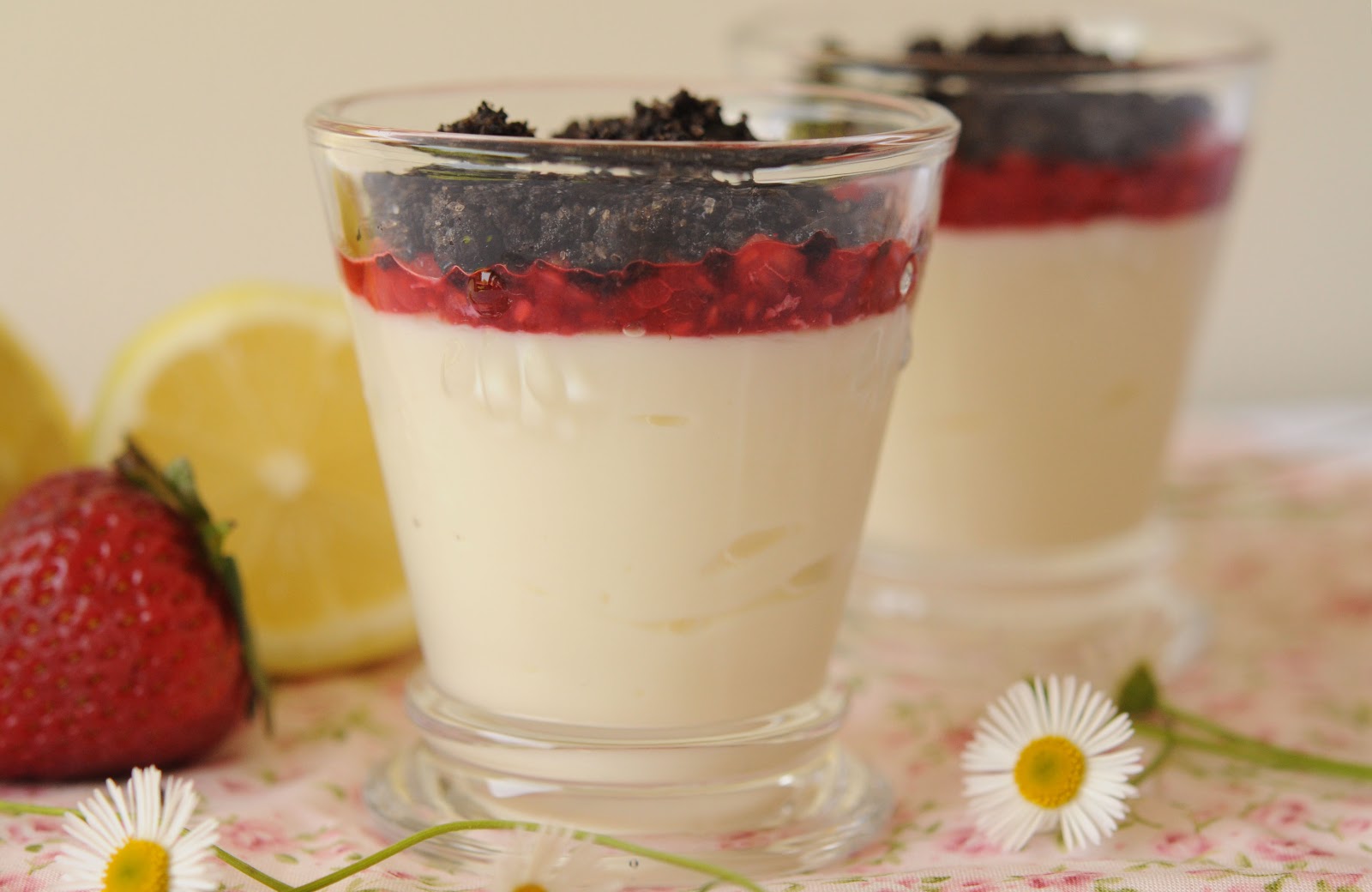 el puré de frambuesas y terminar con el crocante de oreo. Refrigerar por un par