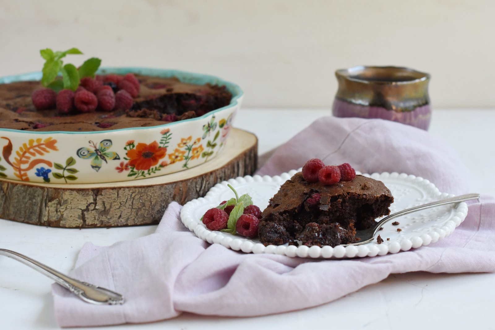 - Mezclar las harinas, el chocolate en polvo y los polvos de hornear. Derretir la mantequilla con la azúcar, el chocolate picado y el té a baño maría, hasta tener una mezcla homogénea. Sacar del fuego, dejar enfriar un par de minutos y luego agregar la mezcla de harina, revolver hasta integrar. Agregar los huevos y finalmente incorporar las frambuesas en forma envolvente. Poner la mezcla en la fuente preparada. Hornear por 40 a 45 minutos o se sienta firme al tacto. Servir tibio o a temperatura ambiente.