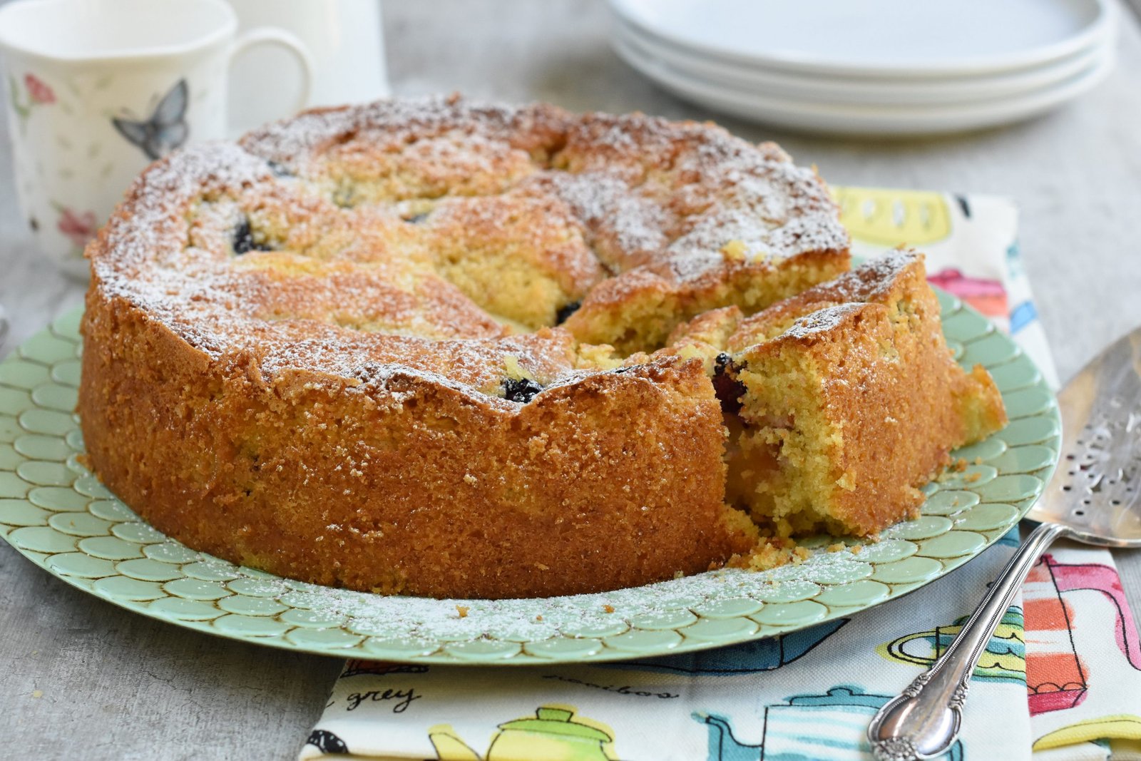 • Batir la mantequilla junto a la ralladura y azúcar, hasta tener una mezcla pálida y cremosa (esta parte es muy importante para un obtener un queque esponjoso). Agregar los huevos de a uno, y batiendo bien hasta integrar. Incorporar la mitad de la mezcla de harina y el jugo, batir para integrar bien (es normal que se vea como cortado). Por último, añadir el resto de la harina y batir hasta mezclar. Poner la mezcla en el molde preparado, distribuir los duraznos y moras.  Hornear por 45 minutos, luego tapar con un pedazo de papel de hornear y seguir horneando por 15 a 20 minutos o hasta meter un palito al medio, éste salga seco. Una vez listo, sacar del horno, dejar enfriar y luego desmoldar.  Servir espolvoreado con azúcar flor
