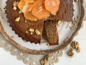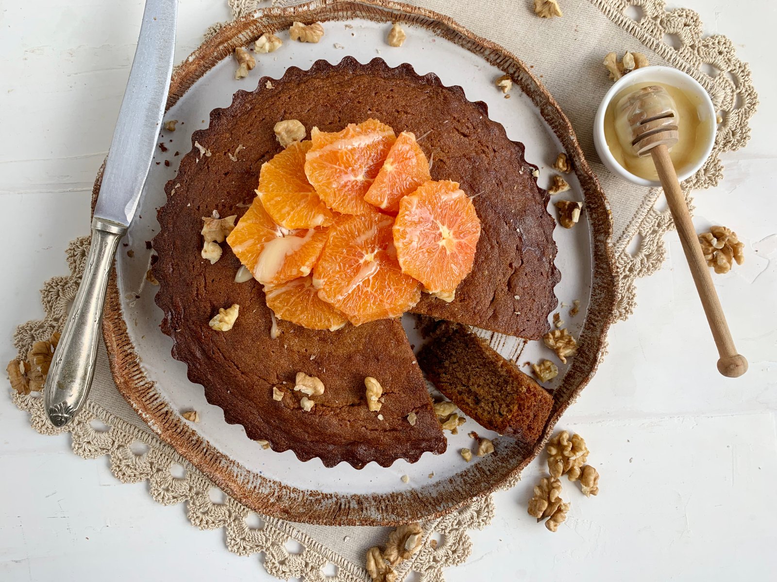 - Batir la mantequilla con el azúcar y la miel hasta tener una mezcla pálida y cremosa. Agregar los huevos de a uno, batiendo bien antes de agregar el siguiente. Incorporar la ralladura. Finalmente añadir la mezcla de harina y nueces, batir sólo hasta integrar. Poner la mezcla en el molde preparado y hornear por 35 a 40 minutos o hasta qué al meter un palito, éste salga seco. Dejar enfriar y desmoldar. Poner en un plato, decorar con lonjas de naranjas, nueces y miel.