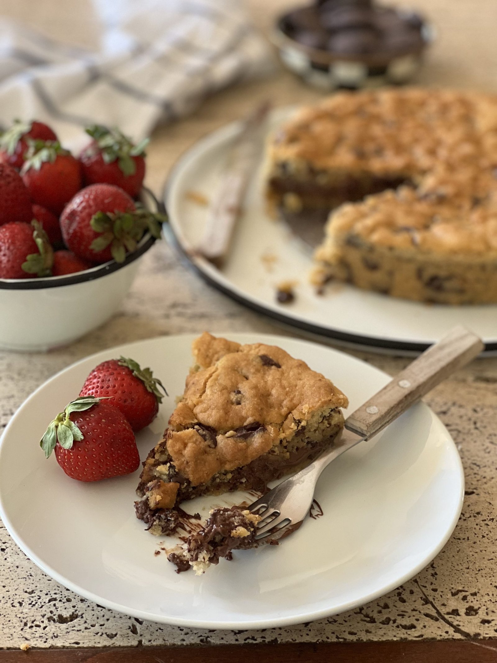 Batir la mantequilla con ambas azúcares hasta tener una mezcla cremosa (con máquina o a mano). Añadir el huevo y vainilla e integrar bien. Incorporar la harina, polvos de hornear y chips de chocolate. Poner la mitad de la masa en el fondo del molde. Luego distribuir la nutella, dejando un borde de 1 cm aprox. Luego tapar con el resto de la masa, vayan poniendo de a poco con la masa ya aplanada con las manos.