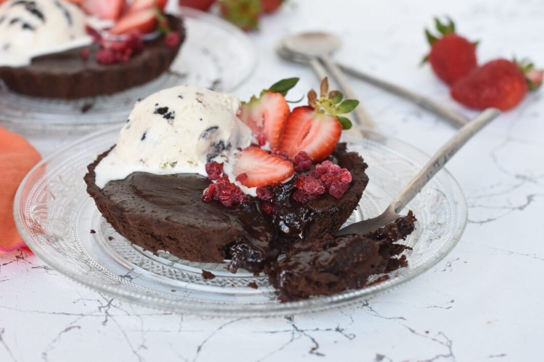 • Calentar el horno a 200C.  Sacar las tartas directamente del refrigerador y hornear por 9 minutos (si no están refrigerados son 8 minutos) o hasta que al moverse parezca gelatina y al medio se vea un poco de mezcla líquida. Desmoldar y servir inmediatamente. Acompañar con frutillas y helado, si quieren.