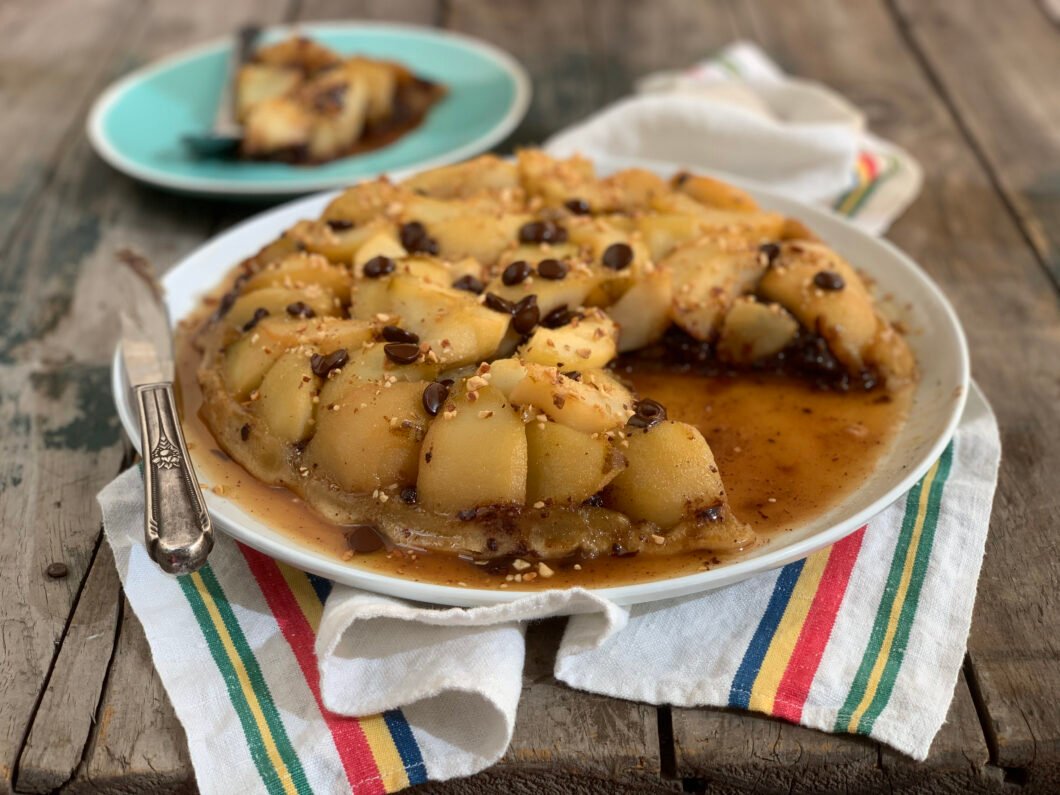 TARTA TATIN DE PERA, CHOCOLATE Y MAZAPÁN