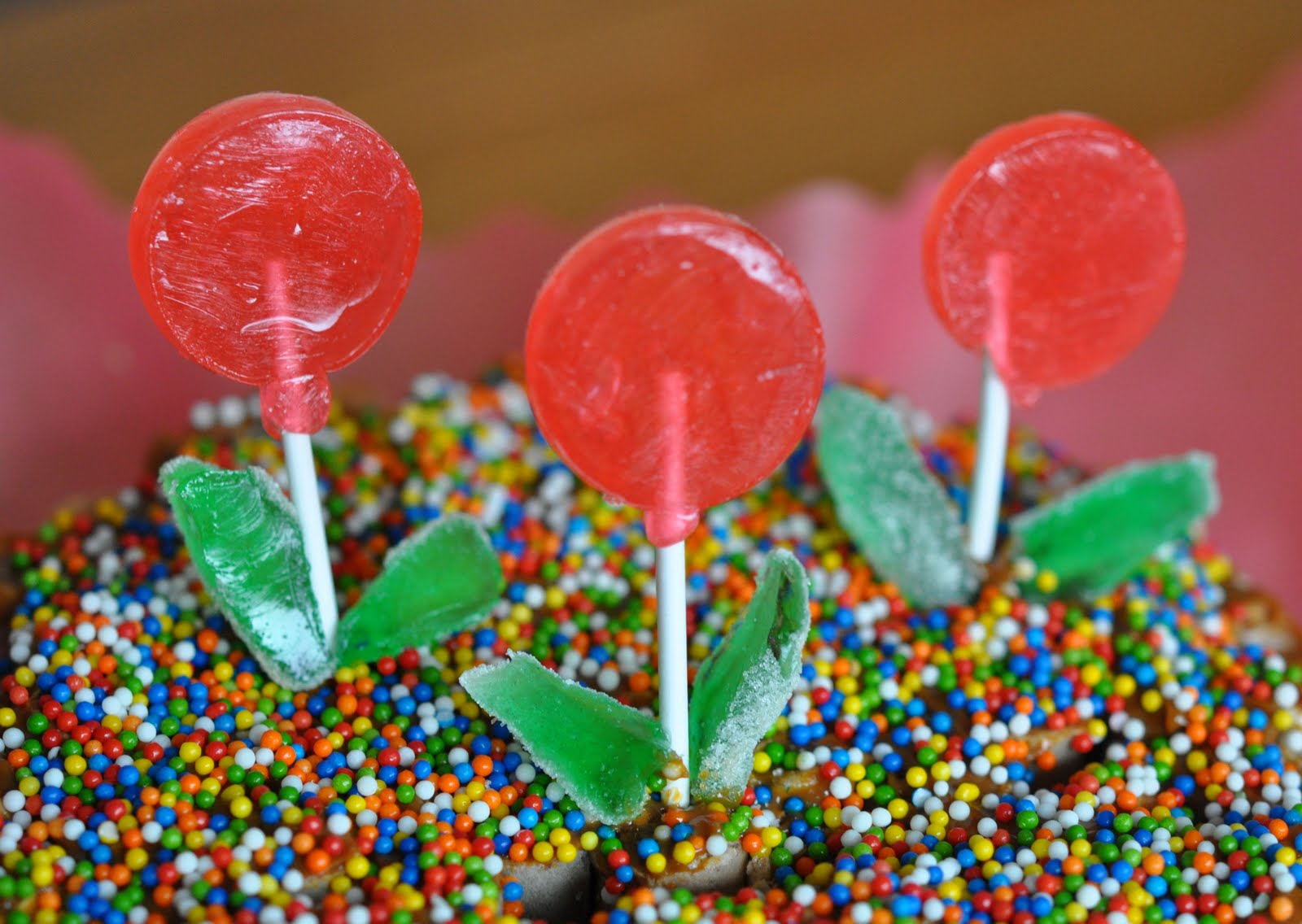 Para las flores, poner las paletas de dulces sobre la torta. Con una tijera cortar gomitas verdes, dándole la forma de hoja.  Poner dos hojas al lado de cada paleta (el manjar sirve de pegamento). Esta decoración  les sirve para los cupcakes o cualquier torta.