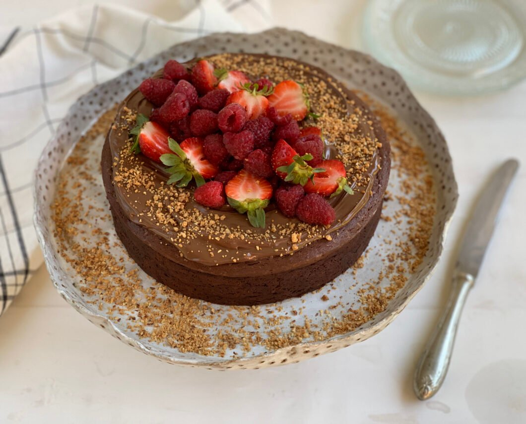 • Vaciar en el molde preparado y hornear por 1 hora o hasta que se sienta cuajado al tacto. Apagar el horno y dejar enfriar la torta en él. Desmoldar, decorar con un poco de nutella (opcional por ya es lo suficiente chancha, yo igual le puse), praliné (opcional) y frutos rojos.