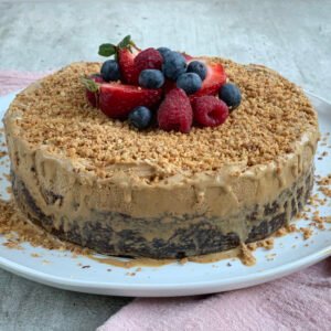 - Para la base, procesar todos los ingredientes hasta tener una mezcla pastosa. Poner en la base de un molde de torta desmontable de unos 23 cm aprox. (con papel mantequilla en el fondo). Hornear a 180C por 10 minutos y luego dejar enfriar.