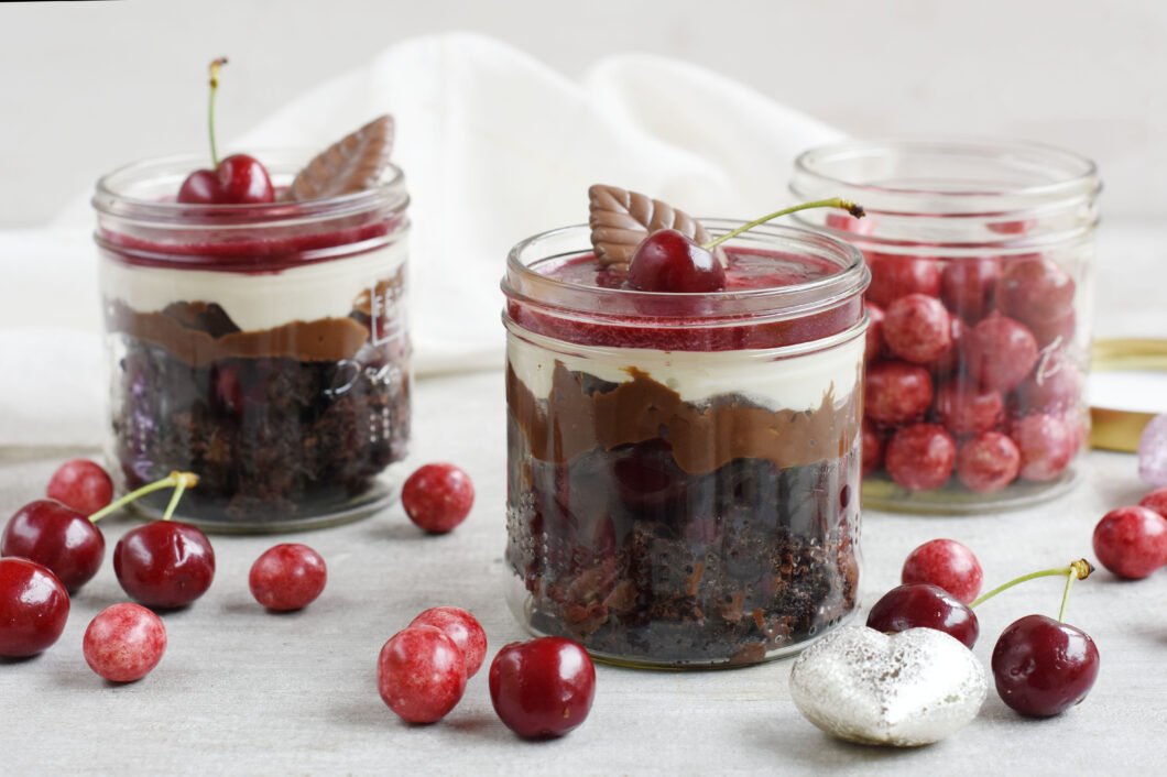 - Poner una capa de brownie en el fondo de 8 vasitos individuales, luego poner una capa de cerezas picadas (3 a 4 por vaso), seguir con una capa de crema de chocolate, otra capa de queso y terminar con la gelatina. Refrigerar al menos 4 horas. Servir decorado con una guida y dragees de La fete.